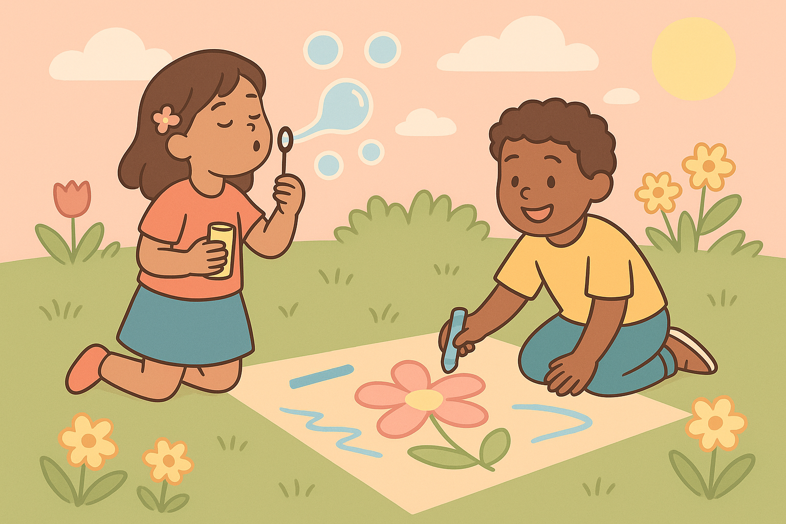 Bring storytelling outdoors! Have kids draw scenes on the driveway or sidewalk using chalk — then turn those drawings into mini plays or puppet shows.