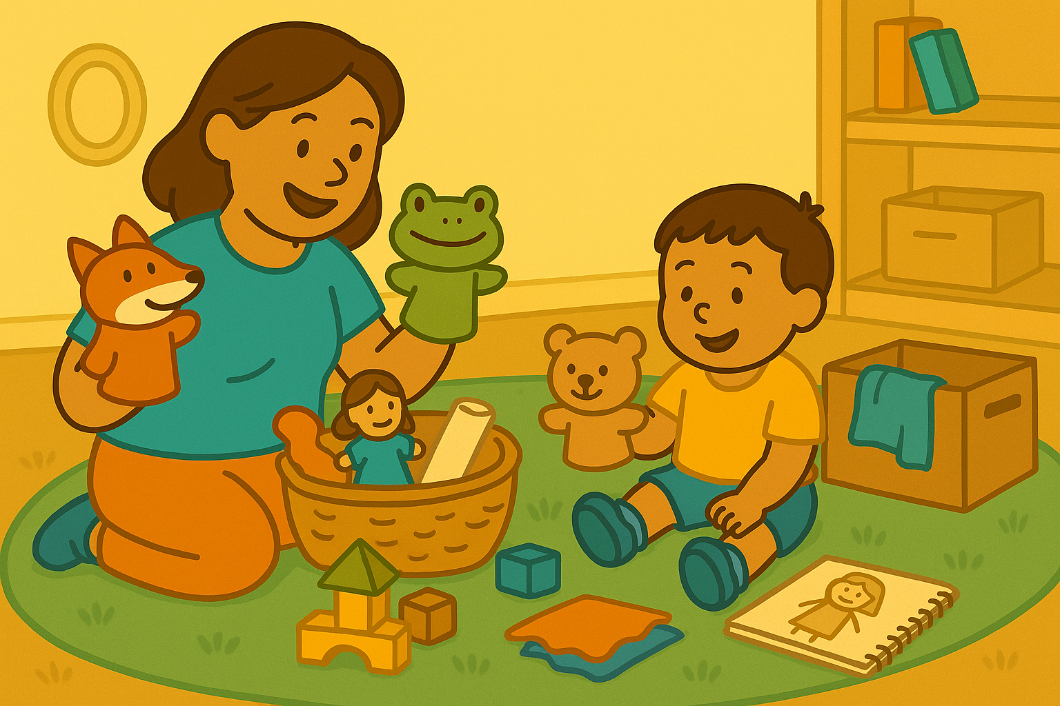 You don’t need a stage or elaborate setup. A puppet story space should feel cozy, simple, and inviting. Children should be able to reach puppets easily, choose characters independently, and bring their stories to life intuitively.